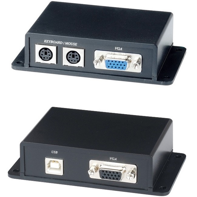Передача сигналов VGA/клавиатура/"мышь" на расстояние до 100м по 2-м кабелям CAT5e. Пассивный, не требует питания. Комплект из приёмника VKM02R и передатчика VKM02T. Разъемы: 2 х RJ-45 (для подключения приемника к передатчику), USB (для подключения к компьютеру), 2 х PS/2 (для подключения клавиатуры и мыши), 15-Pin (VGA). Разрешение до 1280x1024. Размеры каждого устройства (ШxВxГ): 108x27x74мм. Рабочая температура -40...+55°C.